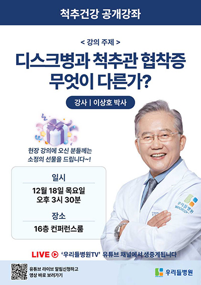 우리들병원이 척추 건강 증진과 예방을 위해 ‘척추건강 공개강좌’를 새롭게 신설하였습니다. '우리들병원TV' 유튜브 채널에서 생중계 될 예정이며, 누구나 참여 가능합니다 · 대상 · 누구나 참여 가능 · 시간 · 오후 15:30~16:00 · 장소 · 청담 우리들병원 16층 컨퍼런스 룸 · 프로그램 일정 · - 09.24(수) 척추관협착증 단계별 치료와 치료 후 관리 (최용수 원장) - 10.16(목) 척추 내시경이란 무엇인가? (김신재 원장) - 11.12(수) 척추치료의 선택 (금한중 원장) 건강강좌는 무료로 진행됩니다.