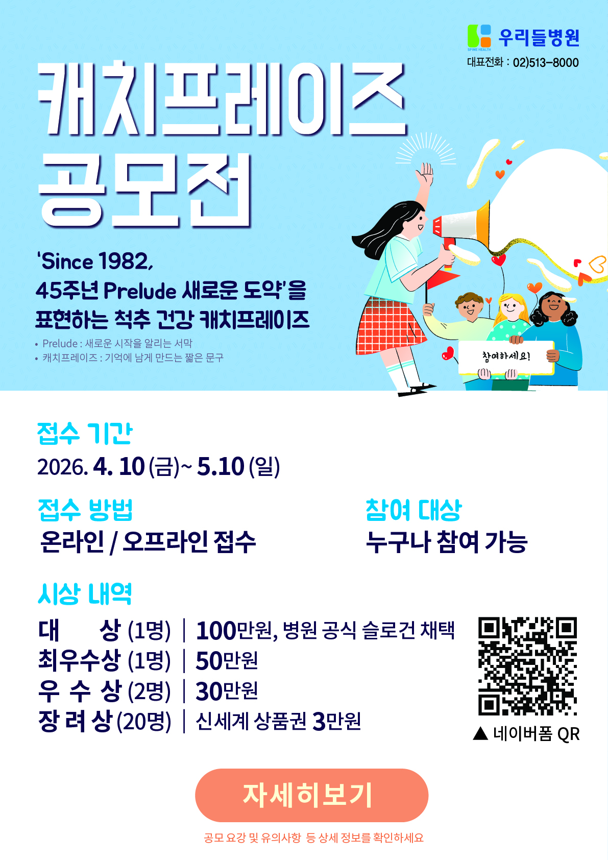올해도 어김없이 찾아온 개원기념 축하이벤트! 이번 우리들병원 캐치프레이즈 공모전은 ‘Since 1982, 45주년 Prelude 새로운 도약’을 표현하는 척추 건강 캐치프레이즈를 찾기 위해 마련되었습니다. 누구나 참여할 수 있으니 좋은 아이디어가 있다면 응모해주세요! *응모분야 : 캐치프레이즈 공모전 *이벤트 기간 : 2026.04.10(금) ~ 2026.05.10(일) *당첨자 발표 : 2026.05.15(금) ★접수 방법★ ✔️온라인 : 병원 공식 홈페이지 또는 네이버폼으로 접수해주세요! https://naver.me/5MvP513B ✔️오프라인 : 병원 1층 접수함을 이용해주세요! 대상에 선정된 캐치프레이즈는 병원 공식 슬로건으로 사용되며, 수상자에게는 상금 100만원(1명)을, 최우수상 상금 50만원(1명), 우수상 상금 30만원(2명), 장려상 신세계 상품권 3만원(20명) 등을 각각 수여할 예정입니다. 여러분의 문장이 우리들병원의 새로운 얼굴이 될 수 있습니다. 기억에 남는 한마디로 우리들병원의 45주년과 새로운 출발을 함께 표현해 주세요. 정성껏 만든 여러분의 캐치프레이즈를 기다리겠습니다. 많은 관심과 참여 부탁드립니다.