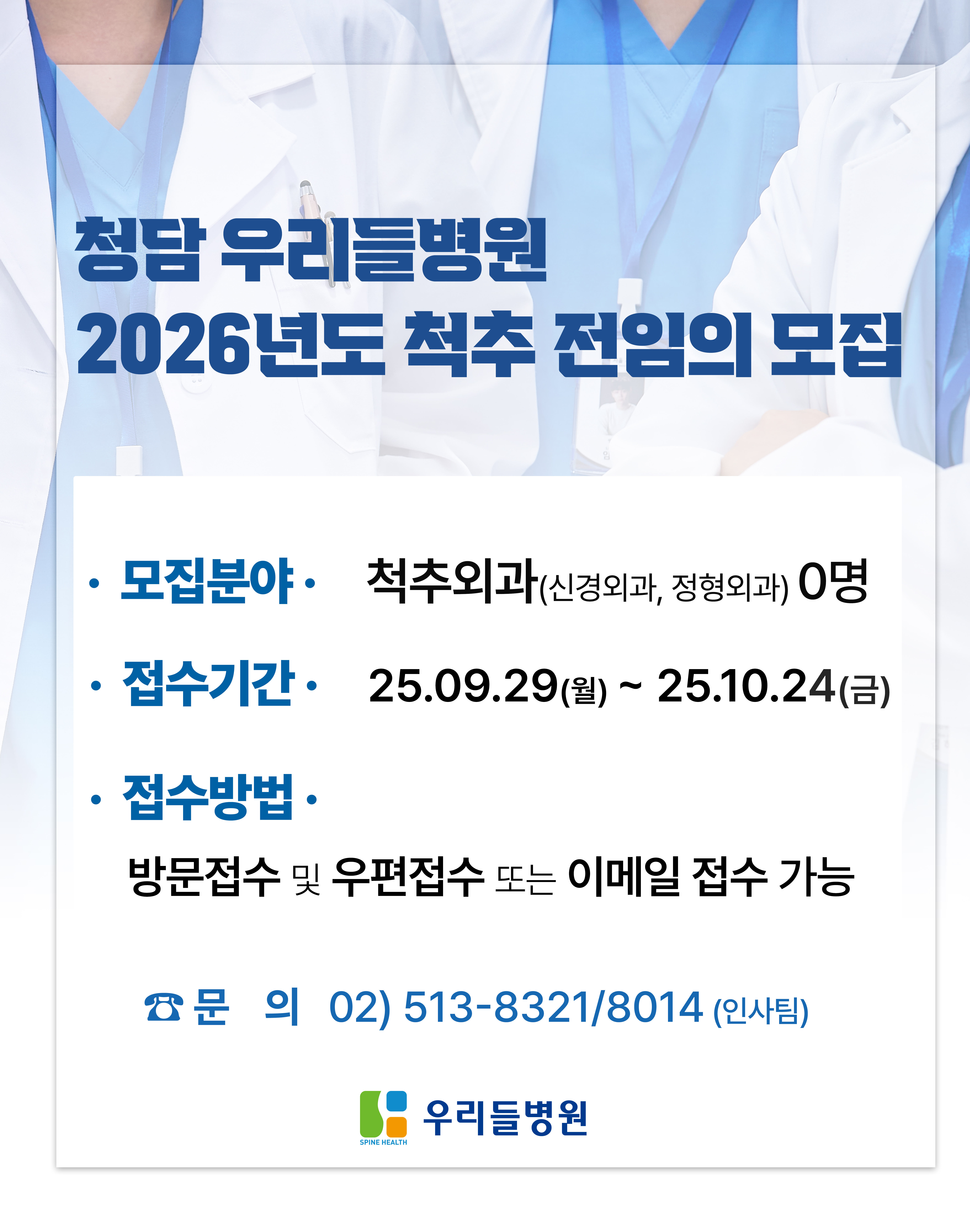 청담우리들병원 2026년도 척추 전임의 모집 1. 모집분야 ◈ 척추외과 ···················· 0명 2. 선발인원 ◈ 전임전문의 ·························· 0명 3. 응시자격 ◈ 전문의 자격 취득자 또는 전공의 수료 예정자 4. 임용기간 ☞ 2026년 3월 3일 ~ 2028년 2월 29일까지 2년간 (단, 전역예정자는 2026년 5월 4일 ~2028년 2월 29일까지 근무) 5. 전형방법 ◈ 필기 / 면접 및 구술시험 – 2025년 11월 07일(금) 예정 * 필기시험 교재 척추학 3판 – 대한척추신경외과학회 편 * 상기 일정은 변경될 수 있음. 6. 서류접수 : 방문접수 및 우편접수 또는 이메일 접수 ◈ 접수기간 : 2025년 9월 29일(월) ~ 2025년 10월 24일(금) ◈ 접 수 처 - 주소 : 서울특별시 강남구 삼성로707 우리들병원 별관 2층 인사팀(우:06068) [☎ (02)513-8321 / 8014] - 이메일 : jmk82@wooridul.co.kr 7. 제출서류 (1) 지원서(본원양식: 홈페이지 다운로드 / 사진부착 필) ……… 1부 (2) 자기소개서 …………………………………………………………………… 1부 (지원동기 및 전임의 과정의 목적, 연구실적목록 포함) (3) 의사면허증 또는 학위증 사본 ……………………………………… 1부 (4) 전문의자격증 또는 다른 자격증 사본 ………………………… 1부 8. 전임의 수료 후 특전 미국 AAMISS(American Academy of Minimally Invasive Spine Specialist)의 전문의 자격 부여 해외 네트워크 병원 지원 자격 부여 9. 기타 (1) 면접 대상자는 개별통보. (2) 제출된 서류는 일체 반환하지 않음.