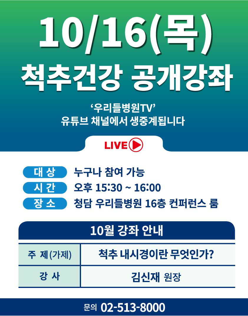 우리들병원이 척추 건강 증진과 예방을 위해 ‘척추건강 공개강좌’를 새롭게 신설하였습니다. '우리들병원TV' 유튜브 채널에서 생중계 될 예정이며, 누구나 참여 가능합니다 · 대상 · 누구나 참여 가능 · 시간 · 오후 15:30~16:00 · 장소 · 청담 우리들병원 16층 컨퍼런스 룸 · 프로그램 일정 · - 09.24(수) 척추관협착증 단계별 치료와 치료 후 관리 (최용수 원장) - 10.16(목) 척추 내시경이란 무엇인가? (김신재 원장) - 11.12(수) 척추치료의 선택 (금한중 원장) 건강강좌는 무료로 진행됩니다.