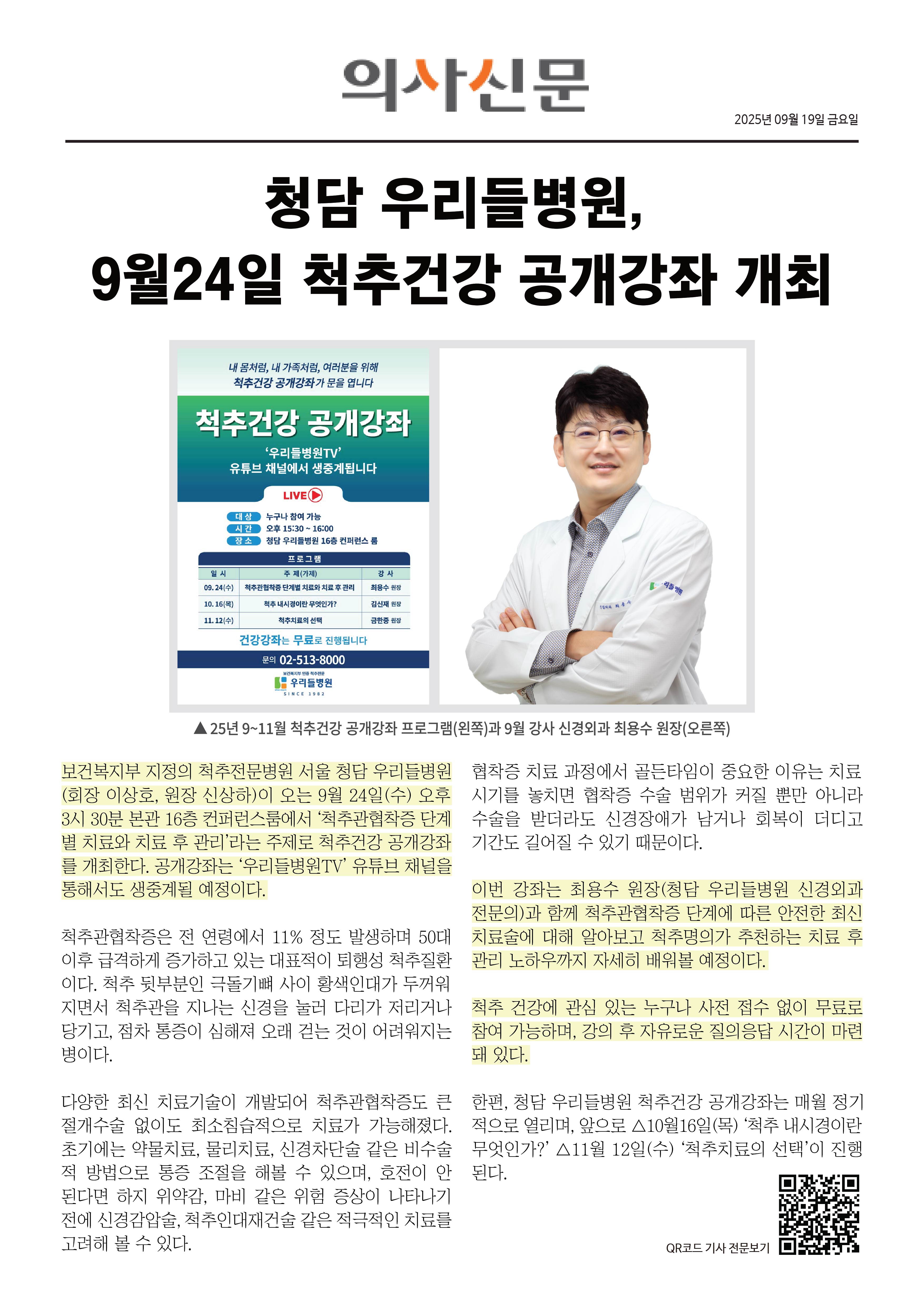 보건복지부 지정의 척추전문병원 서울 청담 우리들병원(회장 이상호, 원장 신상하)이 오는 9월24일(수) 오후 3시30분 본관 16층 컨퍼런스룸에서