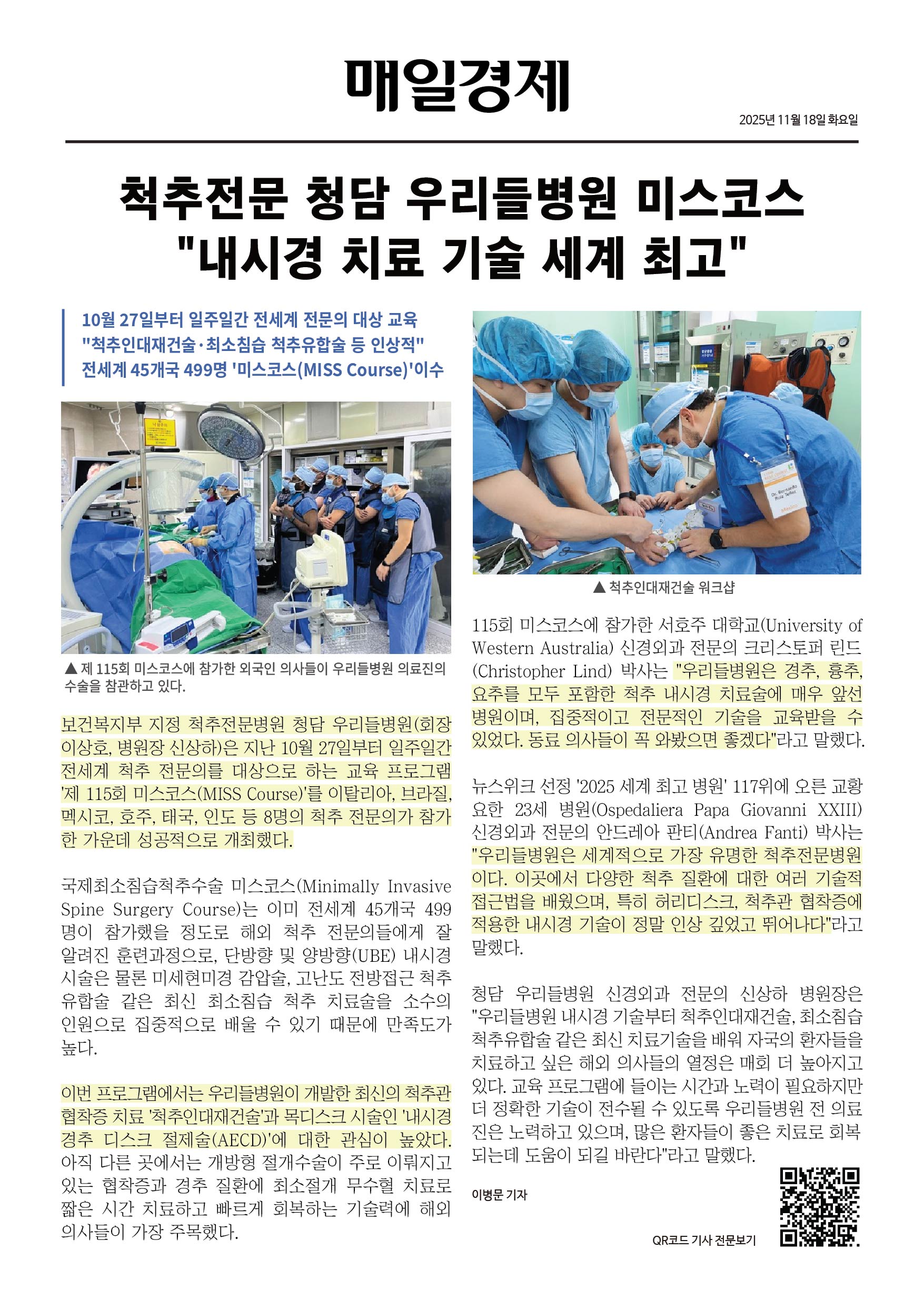 "척추인대재건술·최소침습 척추유합술 등 인상적"
