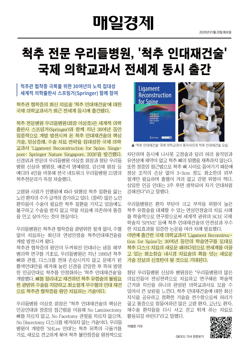 척추 전문병원 우리들병원(회장 이상호)은 세계적 의학출판사 스프링거(Springer)와 함께